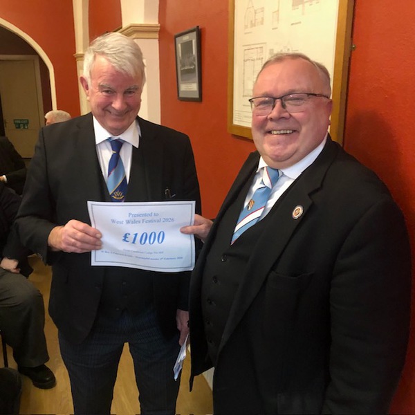 The first was the presentation of a £1,000 cheque, generously donated in support of the West Wales Festival. The contribution reflects the continued commitment of Cambrian Lodge and the wider principles of charity and benevolence. The cheque was formally handed over during the toast to Masonic Charities, with festival steward acknowledging the positive impact such donations make locally and beyond.