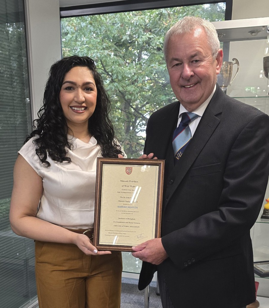 On Thursday 16th October 2025 the Assistant Provincial Grand Master W Bro Michael Eckley, accompanied by the Deputy Provincial Grand Director of Ceremonies, W Bro Marc Bassett attended Aberystwyth University to present the annual Dr John Lloyd Bursary. This year's recipient was Hannah Desousa who is studying a Master's Degree in Parasite Control. She previously attended Aberystwyth University and graduated with a First-Class Veterinary Biosciences BSc (Hons) Degree in 2021. She was delighted to receive the award and was pleased to hear of the generosity of West Wales Freemasons towards such causes. She would keep us updated on progress on her research in her current project.
