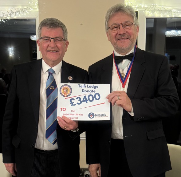 The new master of the Teifi Hallstone Lodge Russell Killick was thrilled to present £3400 to the 2026 Festival Chairman Ryland James and Ryland receiving an urgent call from the Festival Treasurer was equally pleased to replace the lodges Bronze Medal with a Silver award showing the lodge has donated over £820 per member towards the West Wales 2026 Masonic Charitable Foundation Festival.